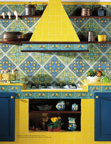 Piastrelle “Amalfi” impreziosiscono con i colori del Mediterraneo una cucina. Foto: Giovanni De Maio srl