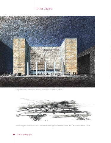 terza pagina Gregotti Associati, Palazzo Italia, Pechino, 1999. ©Comune di Milano, CASVA Vittorio Gregotti, Concorso per la nuova sede dell’Università degli Studi di Firenze, Firenze, 1971. ©Comune di Milano, CASVA 88 2/2020 aprile-giugno